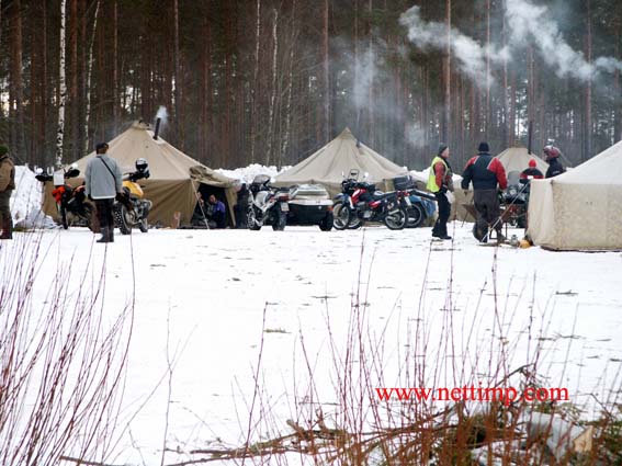 Motoristien talvitapahtuma Talviralli 2004 keräsi helmikuun ensimmäisenä viikonvaihteena noin 85 pyöräkuntaa Kalakoskelle, noin 13 km Peräseinäjoelta Virtain suuntaan. Maatilamatkailu Välimaan pellolla talvimotoristeja odottivat valmiiksi pystytetyt puolijoukkueteltat kaminoineen. Puuhamiehinä olivat toimineet ainakin Rymy ja Matti Saarinen. Pistän hieman tekstiä talvimopoilusta ettei tule aika pitkäksi kuvien latautumista odotellessa.