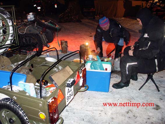 Saksalaiset käyttivät kaminaa vain oluen lämmittämiseen. Yöllä kamina oli ulkona. Teltassa oli tasainen lämpö eikä kaminan luukku kolissut, voin vakuuttaa kokemuksesta. Ensi kerralla varmistan kuitenkin etukäteen makuupussin luokituksen. Lainapussini oli tarkoitettu kesäkäyttöön.