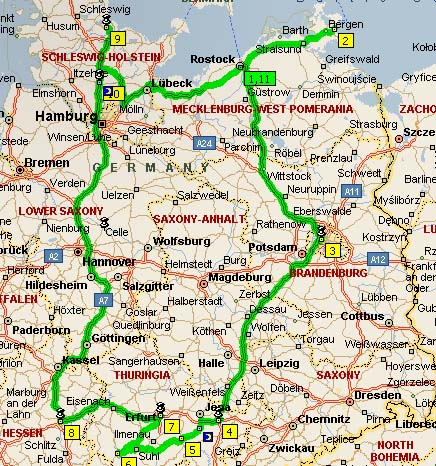 Matka jatkuu kohden Berliiniä jonne saavumme maanantai-aamuna. Innostun "oikaisemaan" ennen Stralsundia ja reitti vie idän kautta koukaten kohden länttä. Tienviitat loppuvat tie muuttuu paikka paikoin todella surkeaksi. Hivuttaudumme kuitenkin sisukkaasti kohden länttä ja löydämme lopulta A 20:n pään. Suomestakaan ei löydy yhtä huonokuntoisia teitä. Paljon on vielä saksalaisilla tekemistä.
