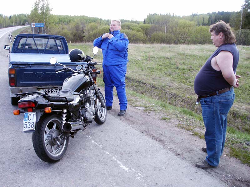 Menomatkan ensimmäinen pysähdys on Hyvinkää-Hanko tien alussa. Vastassa on Kajanderin Juha joka otti hoitaakseen Hondan Night Hawk 750 -94 koeajon jatkamisen. Ensimmäisen tuhannen kilometrin aikana pyörä on pelannut hienosti mutta jotta tuleva uusi omistaja vakuuttuisi niin ajamista jatketaan kunnes ostajan luottamus löytyy.