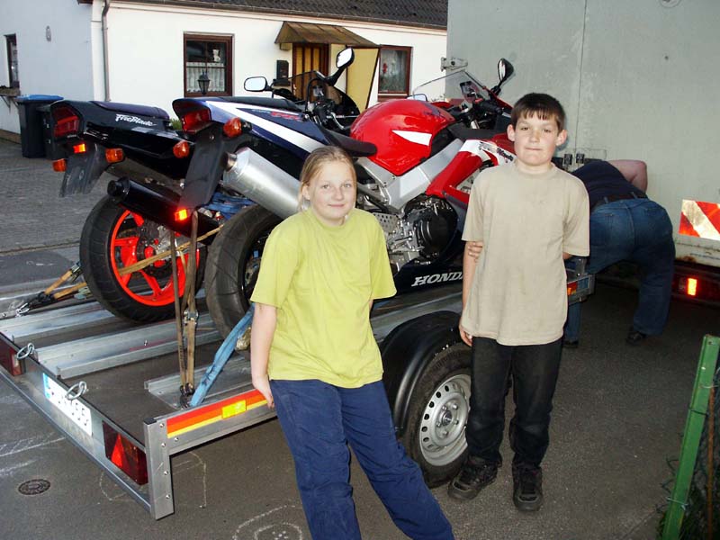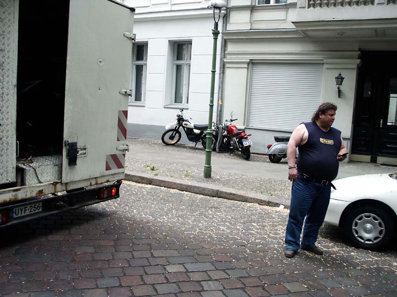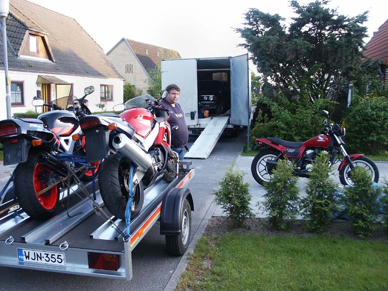 Perillä Berliinissä meitä odottaa Yamahan SRX 600 -89. Salim oli itse valitettavasti Stutgartissa, samoin pyörän avaimet ja tietenkin paperit. Ei muuta kuin kuormaan vaan. Toimitusta hankaloittaa pyörän ohjauslukko. Paikallinen väestö hieman ihmettelee toimiamme mutta ilmeisesti kukaan ei soittanut virkavaltaa paikalle. Mitenkähän olisi käynyt jos olisimme olleet liikkeellä öiseen aikaan? Tapiota hirvitää mutta kaikkeen tottuu...