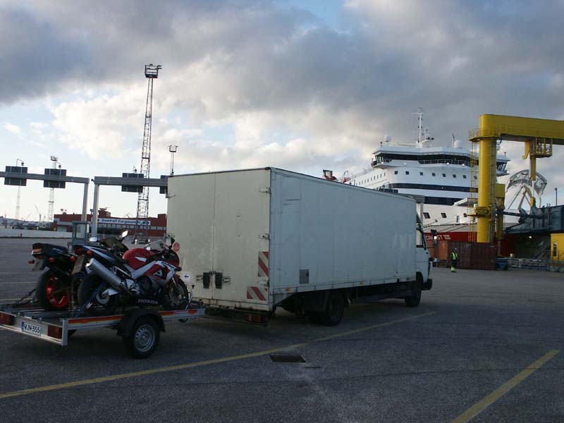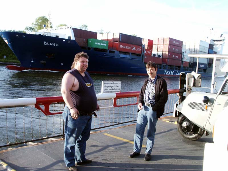 Osdorfissa odottaa Honda VT 500 Ascot. Ostin sellaisen jo 5 vuotta sitten Yhdysvalloista. Ilmeisesti Suomen ainoa Ascot saa nyt seuraa. Loppumatkan ajamme pikkuteitä ja päädymme Kielin kanavan lossirantaan. Samalla lautalla on myös Tempo merkkinen härveli. Se on 150 kuutioinen. Omistaja kertoo, että hänen ystävänsä osti Tempon nelivetomallin Suomesta joltain Honkarakenteen työntekijältä. Pieni on maailma.